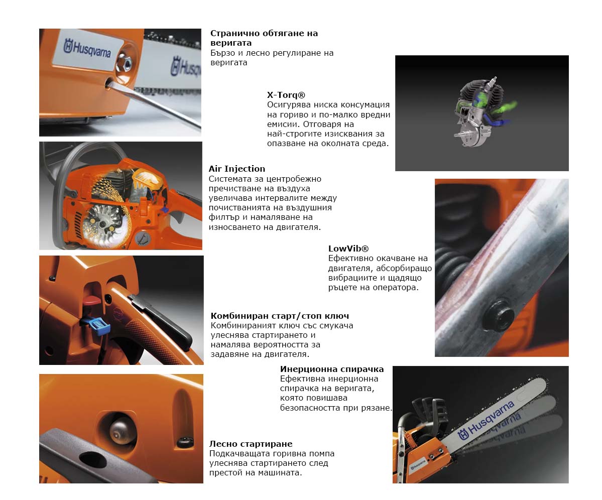 Mоторен трион с повишена производителност предназначен за употреба във вашия дом и градина. Оптималното съчетание между мощност на двигателя и тегло в съчетание с лесно стартиране прави моторният трион подходящ за кастрене, рязане и поваляне на дървета. В двигателя е използвана технологията X-Torq на Husqvarna, което осигурява по-нисък разход на гориво и замърсяване на околната среда. Системата Air Injection намалява замърсяването на въздушния филтър чрез центробежно очистване на въздушния поток преди филтъра, което увеличава периодите на обслужване. За улеснение на потребителите е използван комбиниран старт/стоп бутон и подкачаваща пома за гориво, което намалява усилието при стартиране на двигателя. Трионът се характеризира с ниски нива на вибрации благодарение на системата LowVib.