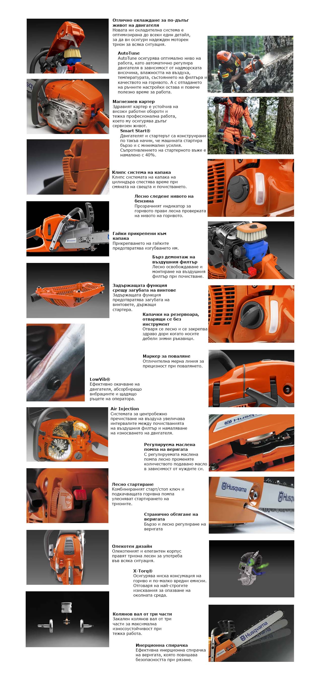 Мощен, надежден и лек моторен трион от серията XP на Husqvarna предназначен за интензивна употреба от професионални потребители и опитни собственици на земя. Оптималното съчетание между мощност на двигателя и ергономичност на машината прави моторният трион подходящ за кастрене, рязане и поваляне на дървета. В двигателя е използвана технологията X-Torq на Husqvarna, което осигурява по-нисък разход на гориво и замърсяване на околната среда както и системата AutoTune за автоматично регулиране на карбуратора. Системата Air Injection намалява замърсяването на въздушния филтър чрез центробежно очистване на въздушния поток преди филтъра, което увеличава периодите на обслужване. За улеснение на потребителите е използван комбиниран старт/стоп бутон и подкачаваща пома за гориво, което намалява усилието при стартиране на двигателя. Трионът се характеризира с ниски нива на вибрации благодарение на системата LowVib. Регулируемата маслена помпа позволява промян на дебита на масло към веригата съобразно условията на рязане и вида на дървесината.